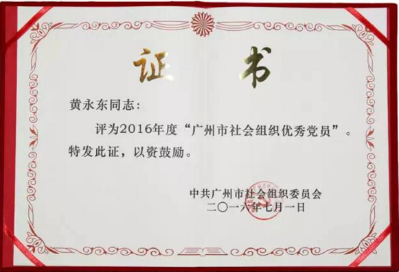2016年7月1日上午,中共廣州市社會組織委員會召開廣州市社會組織慶祝中國共產黨成立95周年暨“兩學一做”學習教育專題報告會。 會上,廣東廣信君達律師事務所高級合伙人、合伙人會議主席黃永東律師榮獲“廣州市社會組織優秀黨員”光榮稱號。