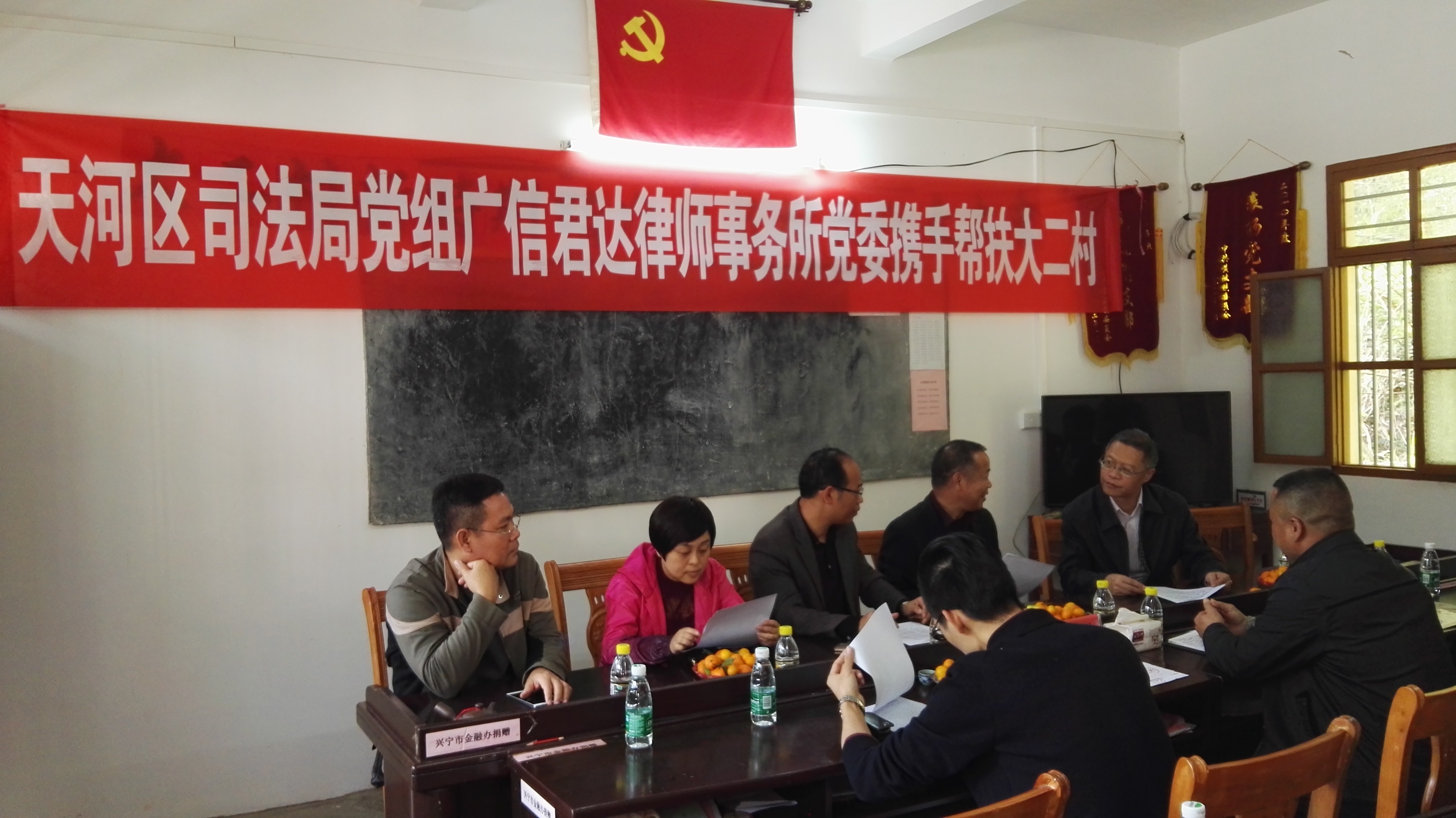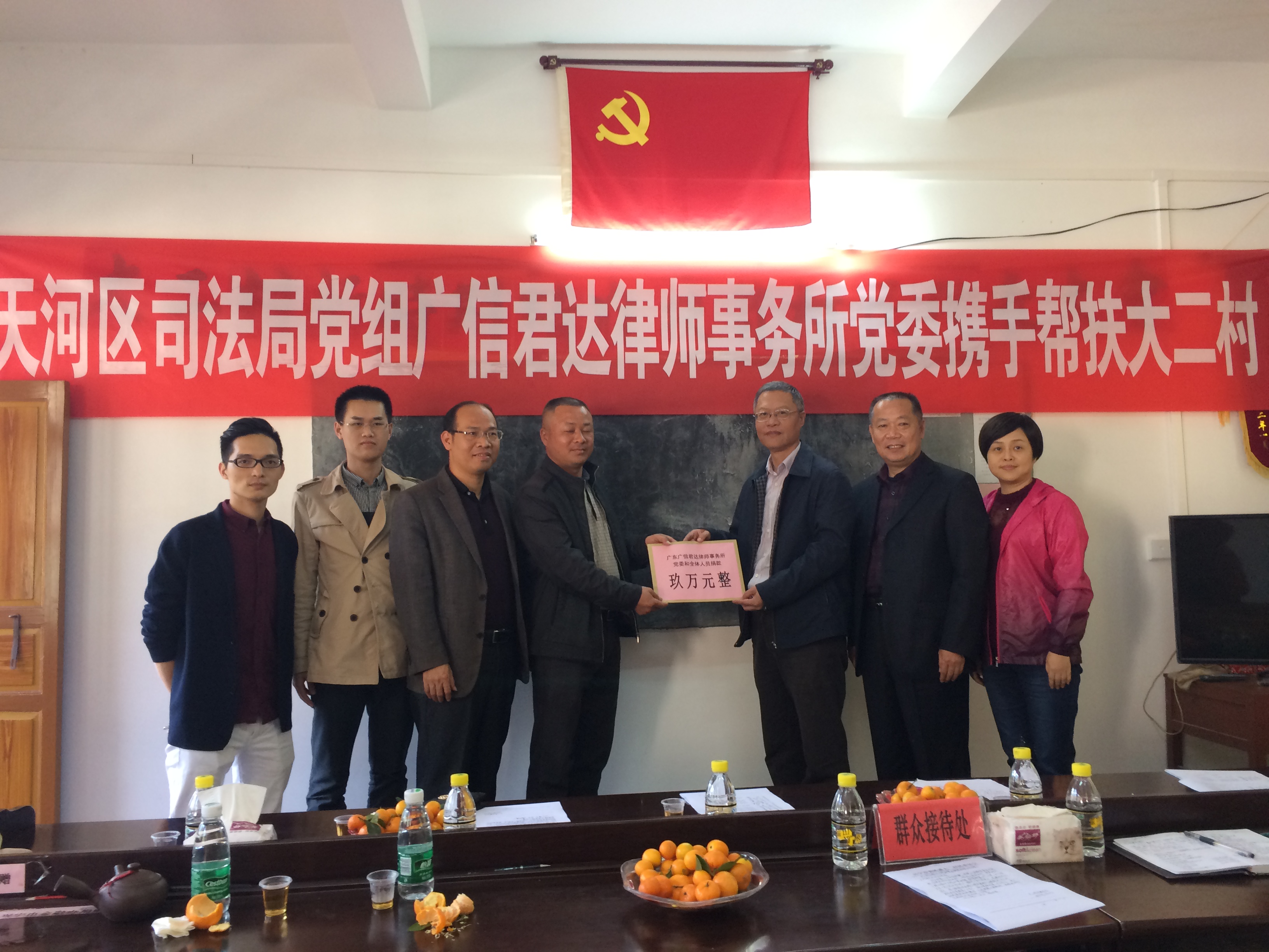 2016年12月23日,在羅育輝局長、鄭茜副局長和胡懿科長一行的帶領下,廣信君達黨委書記章勛、黨委組織委員兼團支部書記黃福軒、業務品牌部主管蔣利一行3人作為廣信君達代表抵達天河區司法局扶貧對口單位興寧市黃陂鎮大二村開展精準扶貧前期考察工作,受到興寧市、黃陂鎮等各級領導,大二村村干部及廣州市天河區政府駐大二村干部的熱情接待。