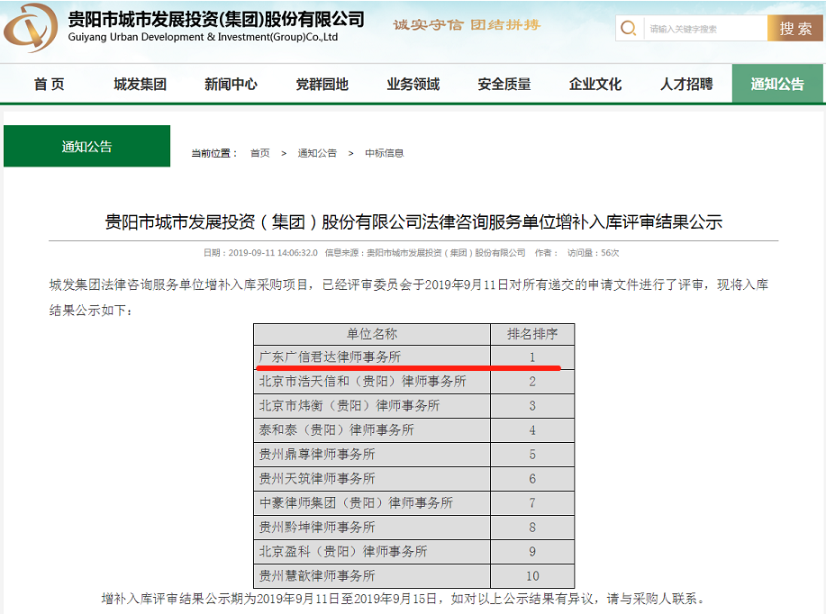 近日,貴陽市城市發展投資(集團)股份有限公司(以下簡稱“貴陽城發集團”)官網公告入選法律咨詢服務單位信息庫結果,廣東廣信君達律師事務所憑借良好的信譽及出色的綜合實力以排名第一的成績入選貴陽城發集團2019年法律咨詢服務單位信息庫。