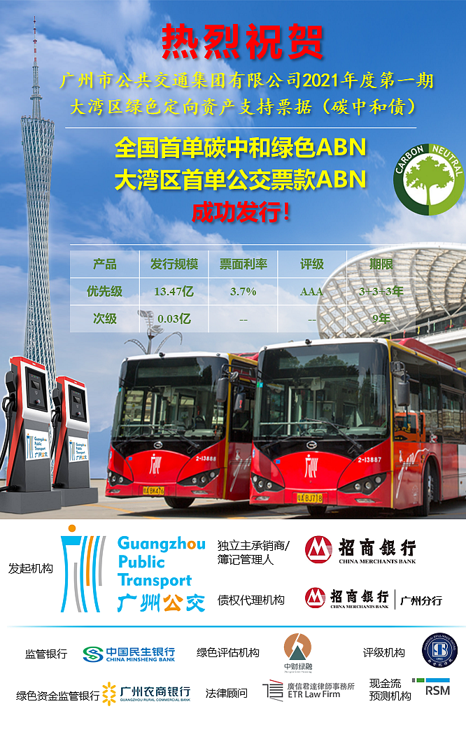 2021年3月23日,在廣州市國資委、中國銀行間市場交易商協會的大力支持與指導下,廣州市公共交通集團有限公司(以下簡稱“廣州公交集團”)2021年度第一期大灣區綠色定向資產支持票據(碳中和債)(以下簡稱“項目”)成功發行,發行規模為13.5億元。該項目不僅是全國首單碳中和綠色ABN,還是大灣區首單公交票款資產支持票據。本次發行,各機構踴躍認購,最后以3.70%票面利率超募成功發行,低于同期AAA評級3年期企業資產支持證券到期收益率36BPs,創2021年以來同類資產證券化產品新低,展現出極佳的示范效應與極高的市場認可度。