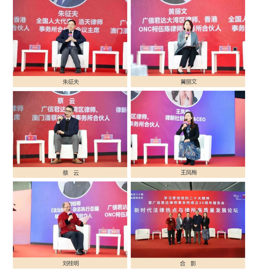 全國人大代表、浩天律師事務所合伙人會議主席朱征夫律師指出,律所的高質量發展要以律師的高質量發展為基礎,要注重培養人才,注重承擔社會責任;廣信君達大灣區律師、香港ONC柯伍陳律師事務所合伙人黃麗文律師,認為律所應注重管理機制的優化,注重律所人才的多樣性;廣信君達大灣區律師、澳門潘蔡徐律師事務所合伙人蔡云律師,認為律所要注重科技手段協助提升服務質量;律新社創始人王鳳梅CEO則分享了她與四十多位大型律所主任訪談“什么是好律所,什么是好律師”的心得體會。