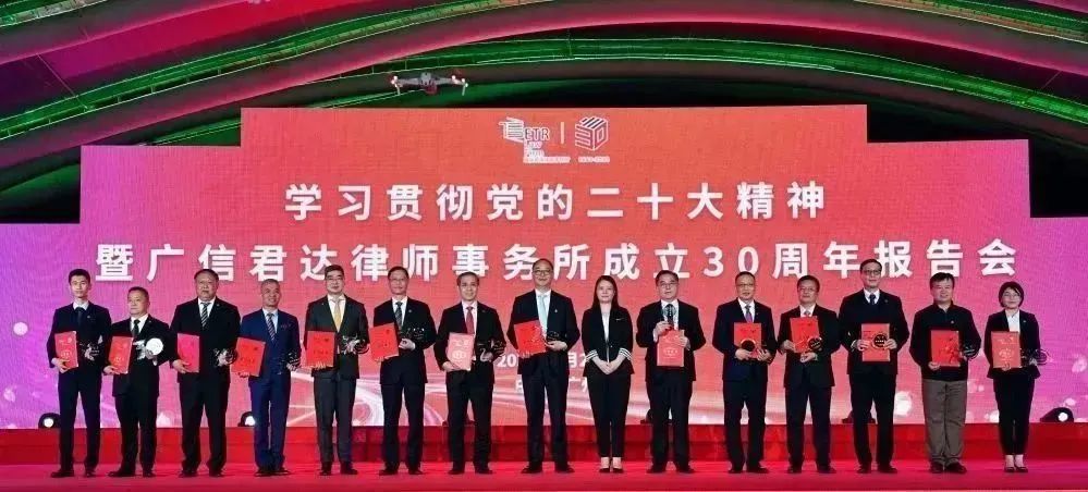 藉廣州深化律師制度改革30年之際,為總結經驗,謀劃未來,篤定高質量發展目標,2023年2月26日,我所在廣州塔舉辦“學習貫徹黨的二十大精神暨廣信君達律師事務所成立30周年報告會”,專家學者、客戶代表、高校校友會領導、律師同仁及我所全體員工等約1200人,歡聚一堂、共襄盛舉,逾萬人通過線上參與。